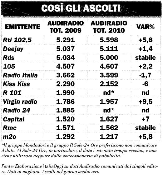 Di seguito i dati d’ascolto delle radio private riferiti all’anno 2009 e l’anno 2010 (fonte italiaoggi.it)
