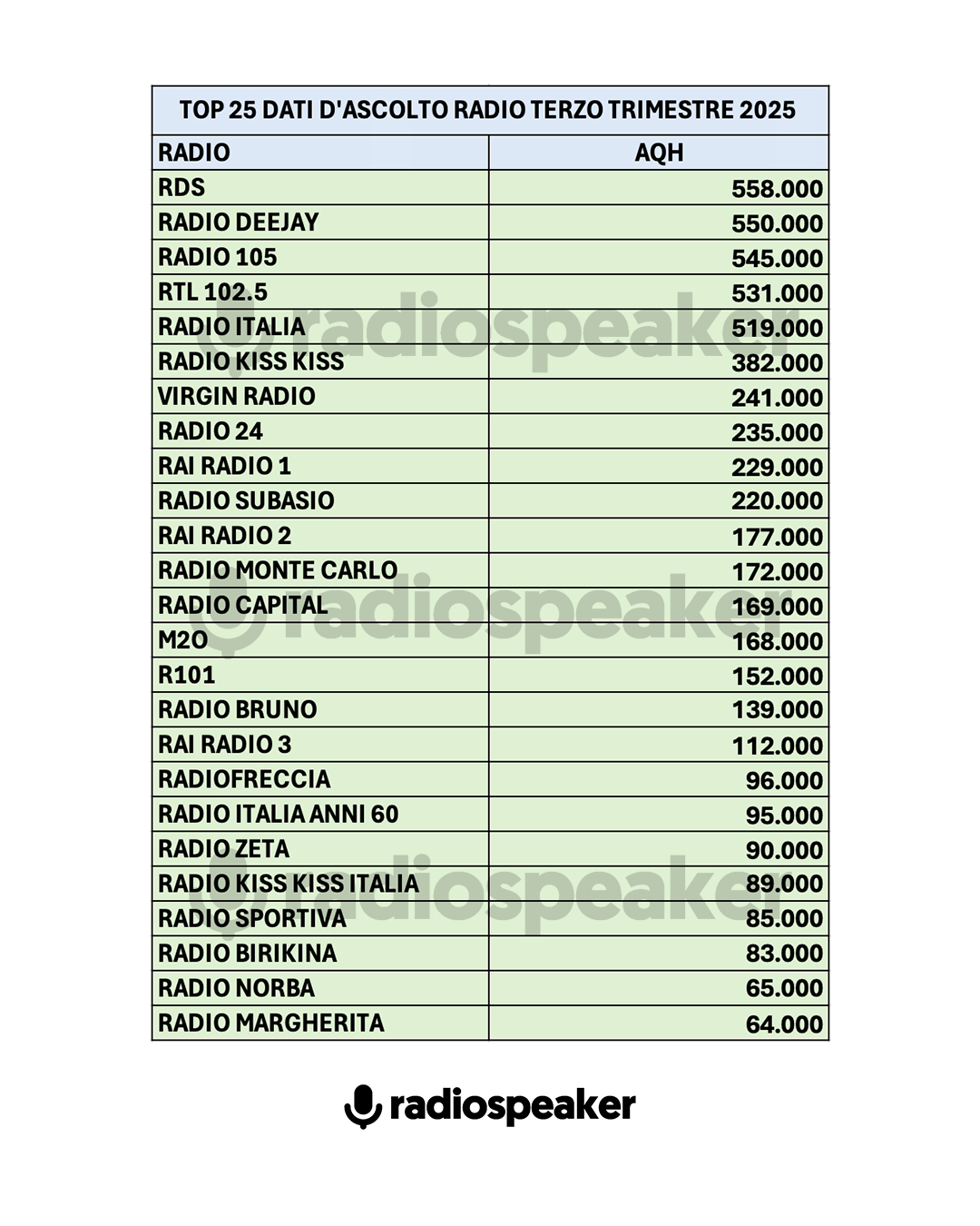 Per questo motivo, anche la nostra analisi su Radiospeaker.it si limita alla fotografia attuale del mercato, senza variazioni anno su anno.
