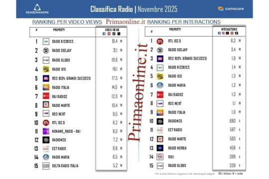 È una fotografia articolata del rapporto tra radio e social network quella che emerge dalla classifica delle radio più attive sui social, realizzata da Sensemakers per Primaonline e relativa al mese di novembre 2025.