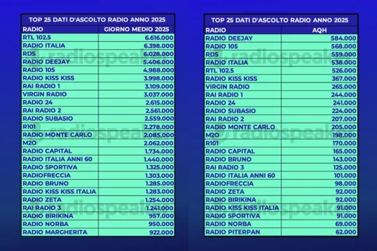 La radio conferma così la propria centralità nel sistema dei media italiani, con un’offerta ampia e differenziata capace di intercettare pubblici diversi e abitudini di ascolto sempre più evolute.