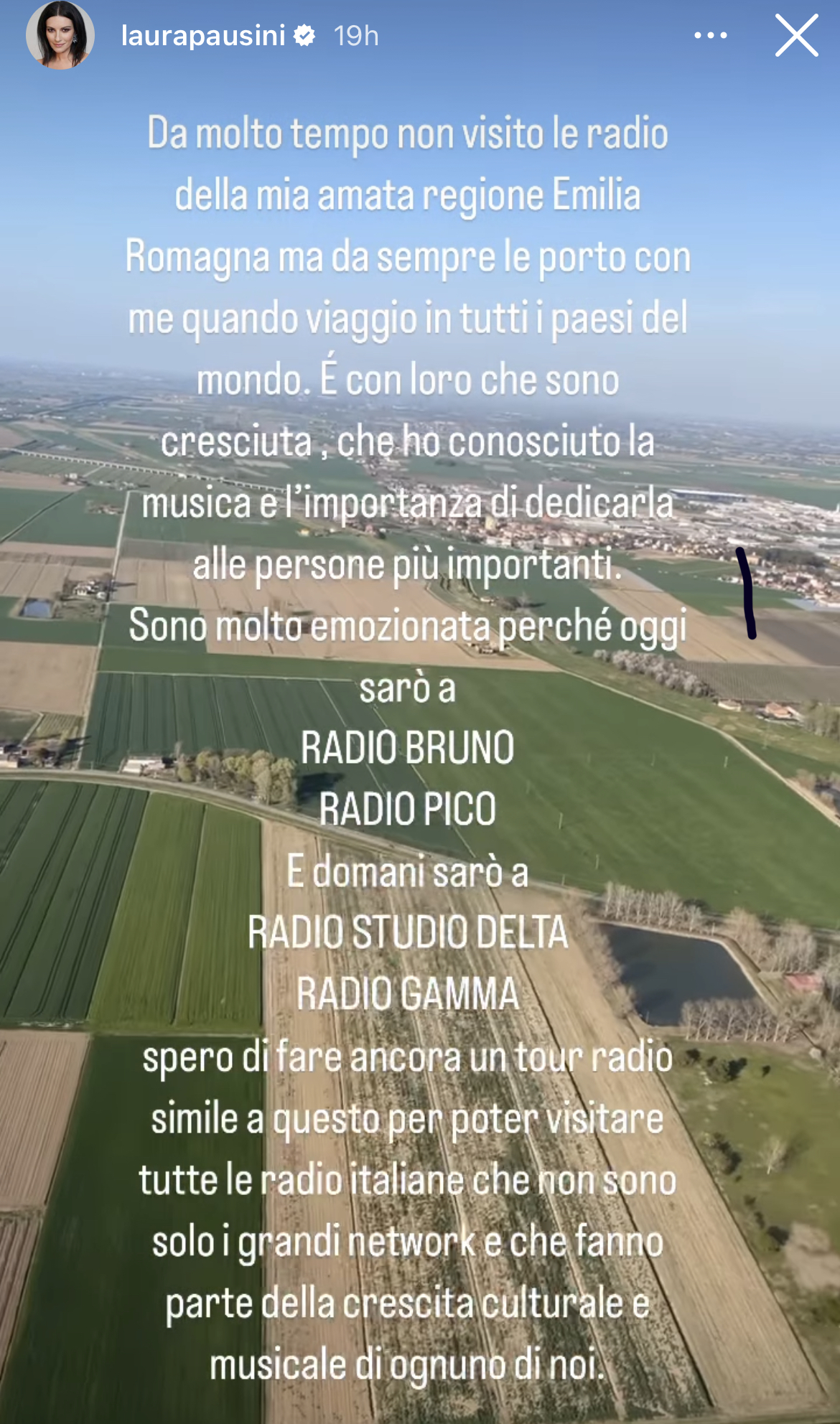 “Da molto tempo non visito le radio della mia amata regione Emilia-Romagna, ma da sempre le porto con me quando viaggio in tutti i Paesi del mondo. È con loro che sono cresciuta, che ho conosciuto la musica e l’importanza di dedicarla alle persone più importanti“ ha scritto la Pausini su IG.