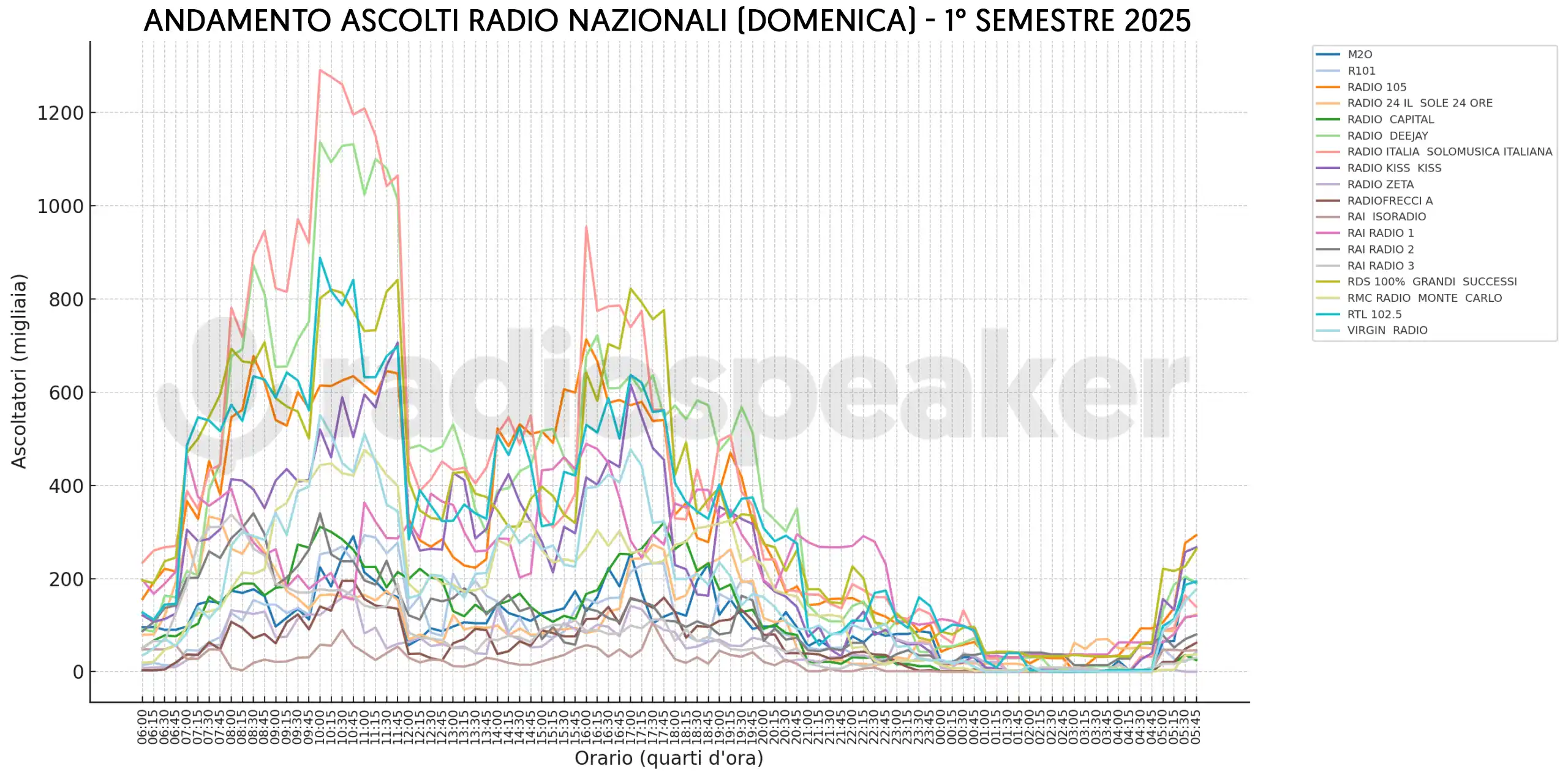 Programmi più “caldi” la domenica: late morning di Radio Italia (10–12) con quarti d’ora di vertice, Deejay competitivo nel tardo pomeriggio e RDS/105 molto presenti nel 15–18.