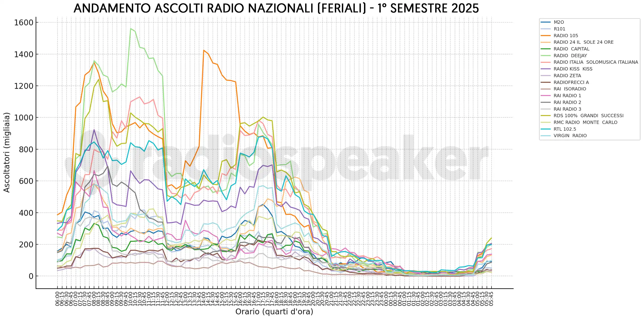 Uno degli aspetti più interessanti dei grafici è il confronto tra radio “a picchi” e radio “piatte”. 105, Radio Italia e Radio Deejay concentrano gran parte della forza d’ascolto in poche fasce, in particolare la tarda mattina e il weekend, con punte da oltre 1,4 milioni di ascoltatori medi per quarto d’ora. Al contrario, Kiss Kiss, RTL 102.5 e RDS mantengono una curva più regolare durante l’intera giornata: nessun picco estremo, ma una presenza costante che garantisce stabilità di pubblico. Questo equilibrio conferma una strategia di radio di flusso puro, costruita su rotazioni musicali omogenee e conduzioni in continuità.