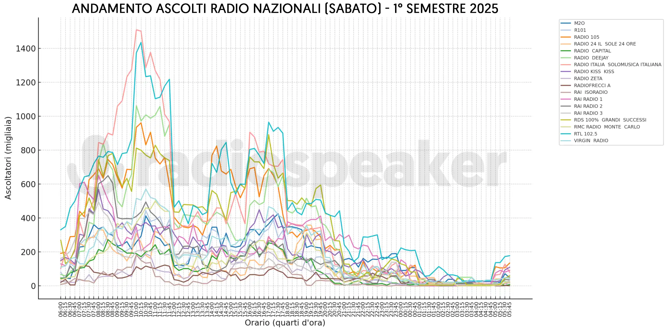 Sabato: Radio Italia domina il mattino, RTL 102.5 sale tra pranzo e pomeriggio